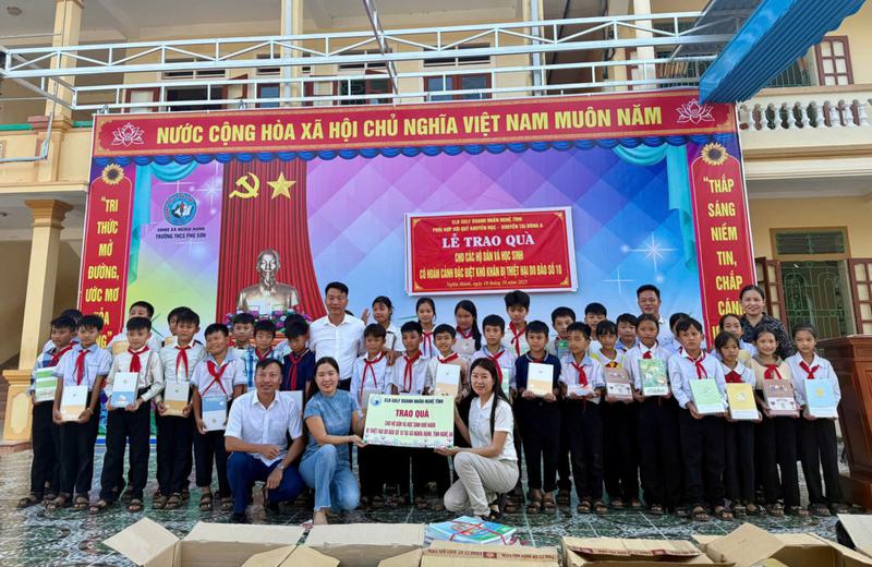 CLB Golf Doanh nhân Nghệ Tĩnh trao quà cho các em học sinh vùng lũ. Ảnh: CSCC