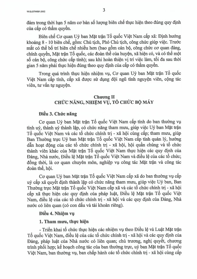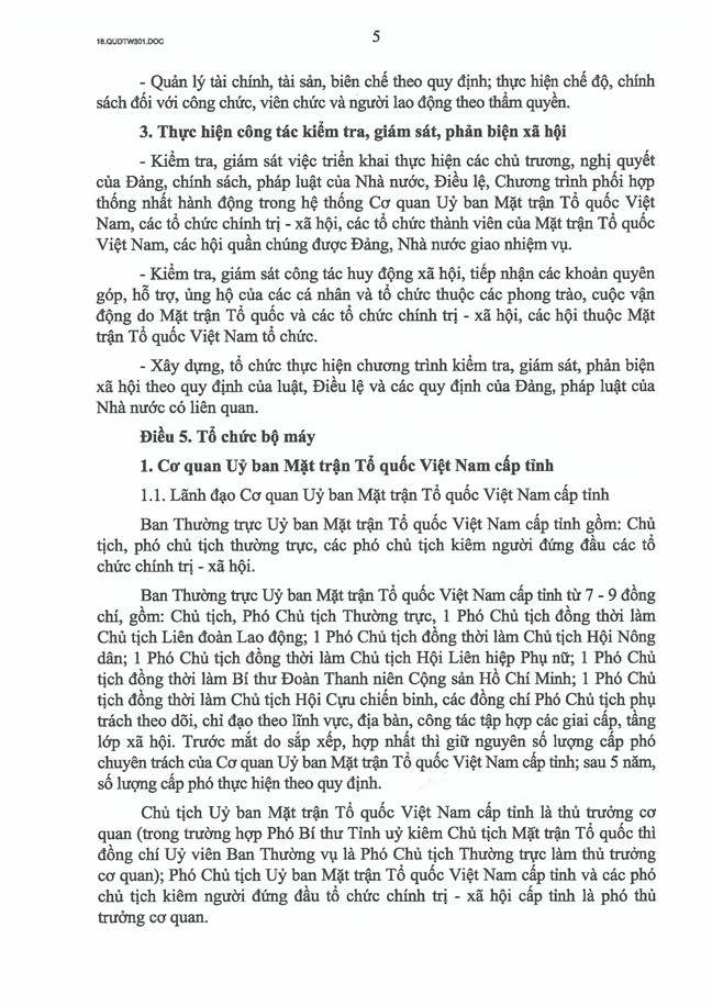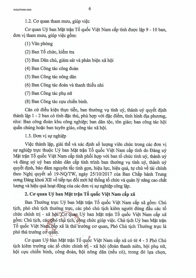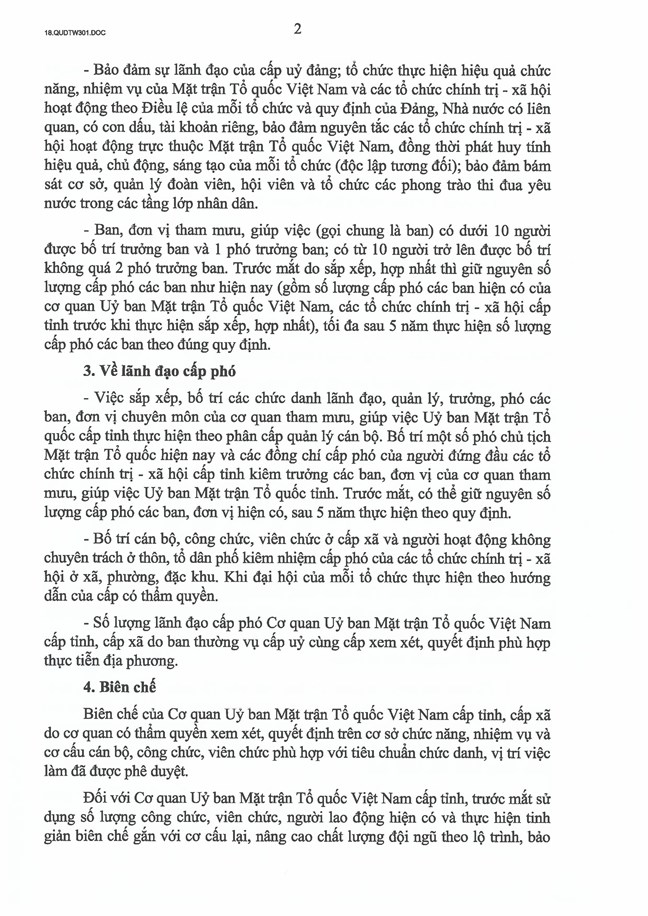 - Số lượng lãnh đạo cấp phó Cơ quan Uỷ ban Mặt trận Tổ quốc Việt Nam cấp tỉnh, cấp xã do ban thường vụ cấp uỷ cùng cấp xem xét, quyết định phù hợp thực tiễn địa phương.