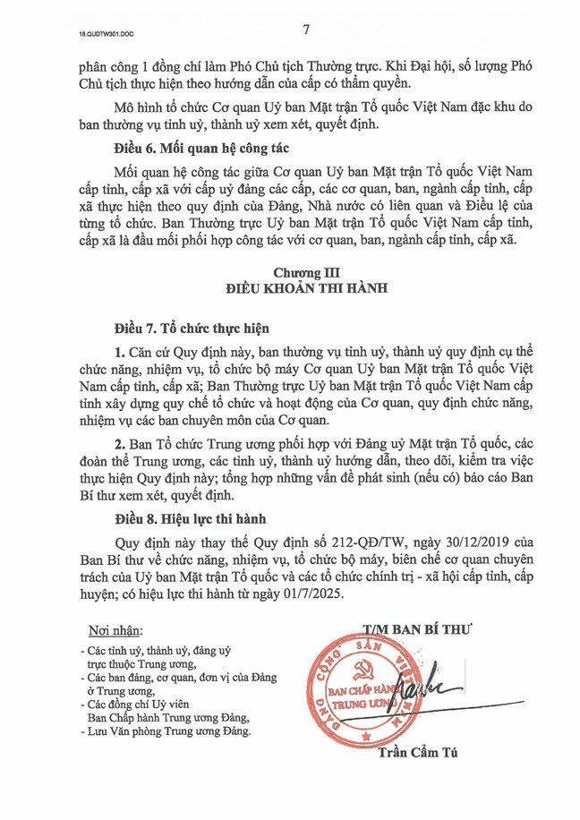 Quy định này thay thế Quy định số 212-QĐ/TW, ngày 30/12/2019 của Ban Bí thư về chức năng, nhiệm vụ, tổ chức bộ máy, biên chế cơ quan chuyên trách của Uỷ ban Mặt trận Tổ quốc và các tổ chức chính trị - xã hội cấp tỉnh, cấp huyện; có hiệu lực thi hành từ ngày 01/7/2025.
