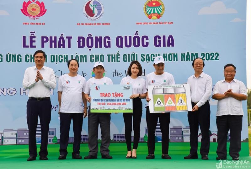 Tại buổi lễ, các đại biểu đã trao tặng thùng rác phân loại của đại diện Công ty Coca-Cola Việt Nam và đại diện Bộ TN&MT cho huyện Diễn Châu; ra quân cộng đồng hưởng ứng Chiến dịch "Làm cho thế giới sạch hơn" năm 2022.