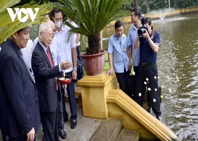Tổng Bí thư Nguyễn Phú Trọng cho cá ăn tại ao cá Bác Hồ trong Khu Di tích Chủ tịch Hồ Chí Minh tại Phủ Chủ tịch.