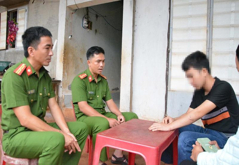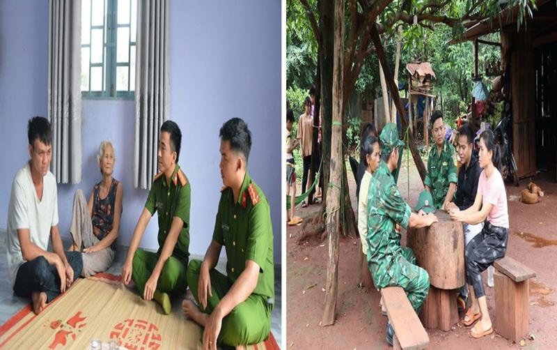Công an xã và lực lượng biên phòng thăm hỏi, động viên các gia đình nạn nhân sau khi trở về địa phương. (Ảnh: PV)